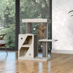 Der MORE Kratzbaum Edward vereint Design und Funktionalitäten in einer hochwertigen und modernen Bauweise. Drei unterschiedliche Ebenen laden zum ausgiebigen Entdecken und Klettern ein, während die breiten und mit hochwertigem grauem Sisal umwickelten Kratzstämme dem täglichen Kratzbedürfnis Ihrer Samtpfote entgegenkommen. Die Kratzstämme stechen dabei insbesondere durch ihren überdurchschnittlichen Durchmesser von ca. 15cm hervor, sodass hier vor allem auch große Katzen ausgiebig ihrem Kratzbedürfnis nachkommen können. Mehrere großzügige kuschelige Liegeflächen bieten ideale Voraussetzungen zum Entspannen und Beobachten. Das Highlight des Kratzbaums ist die großzügige zweistöckige Höhle in der selbst große Katzen bequem Platz finden. Diese ist auch von innen mit kuscheligem Plüsch bezogen, sodass besondere Wohlfühlmomente hier garantiert sind. Alle Liegekissen lassen sich zudem ganz leicht abnehmen und bei Bedarf bei 30° waschen. Egal ob Mehrkatzenhaushalt oder große Samtpfote – der MORE Kratzbaum Edward eignet sich durch seine stabile Bauweise und hochwertige Verarbeitung ideal als Ruheoase, Spielplatz und Kratzmöglichkeit.